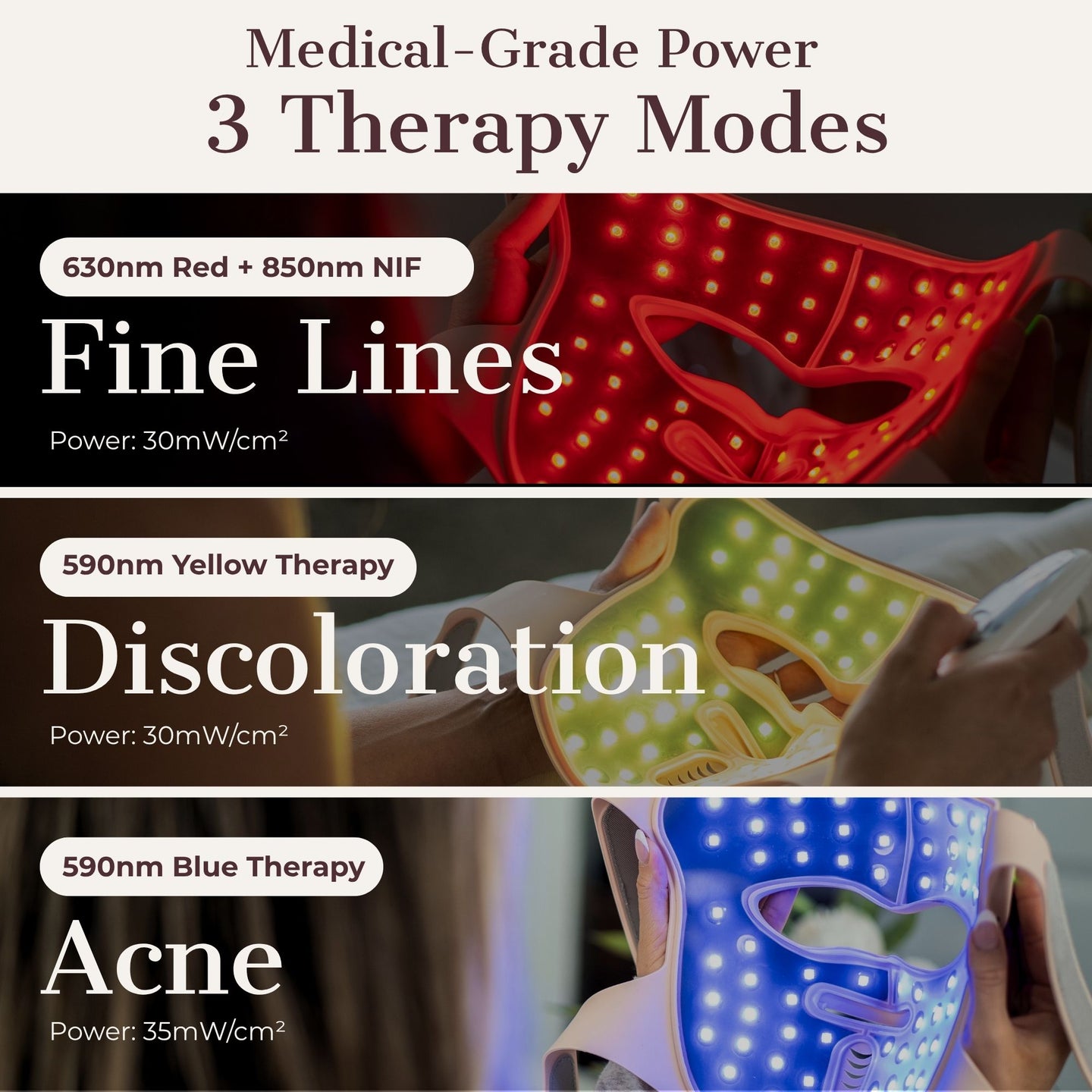 - 3-in-1 Light Therapy: Blue for blemishes, orange for spots, red + NIR for aging skin — most masks don’t offer this range.